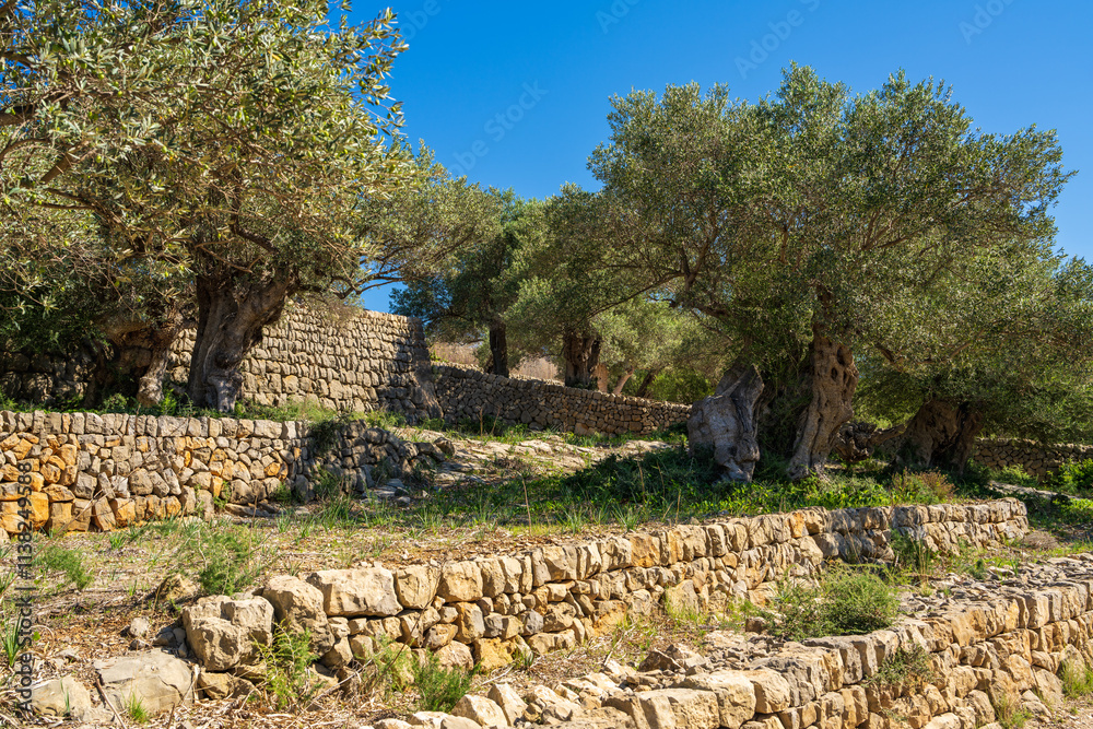 Olive trees cascade on terraces enclosed by masonry fence. Well maintained olive grove harmonizes with natural landscape. Mallorca, Spain