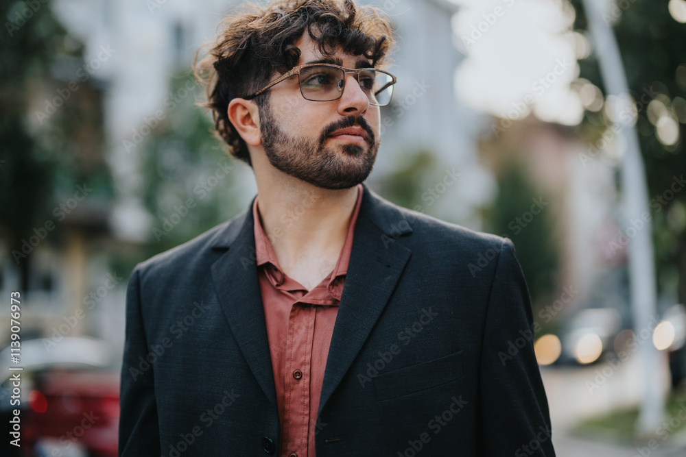 A young professional man in a suit stands outdoors, appearing confident and thoughtful. The urban background adds to the scene's modern, business-oriented feel.