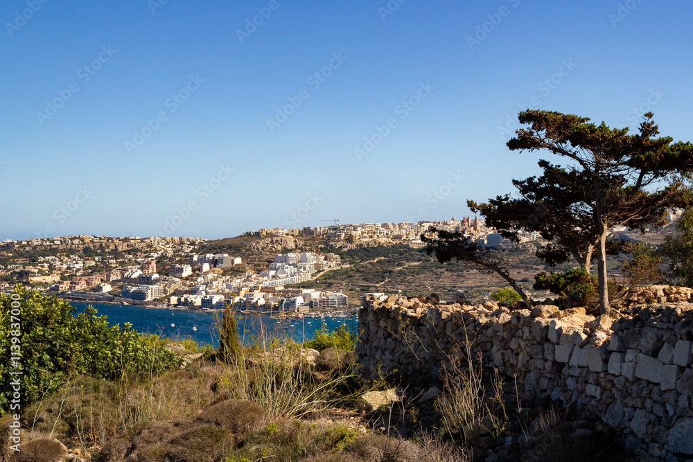 a beautiful cityscape view of Mellieha with the coastline of Mellieha Bay in Malta