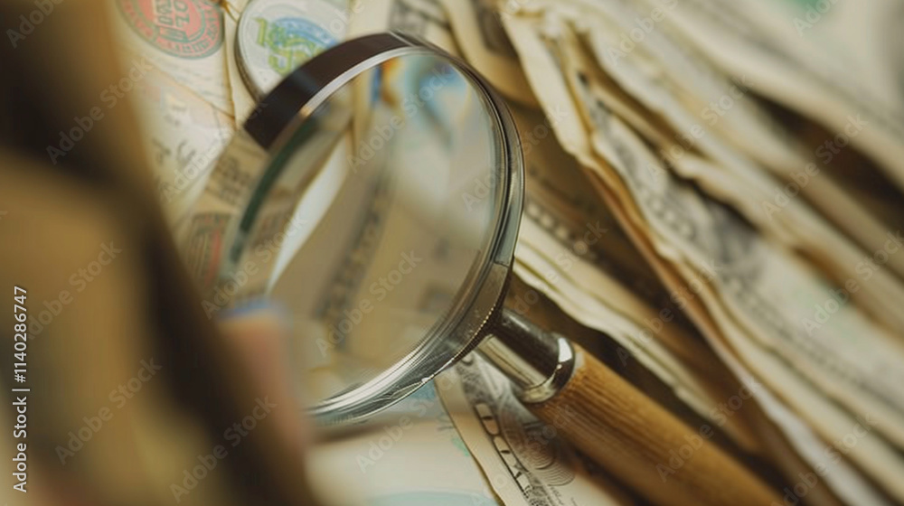 Bank Supervision Magnifying Glass Over Financial Documents, Regulatory Oversight Concept with Blurred Bank Logos and Currency Symbols