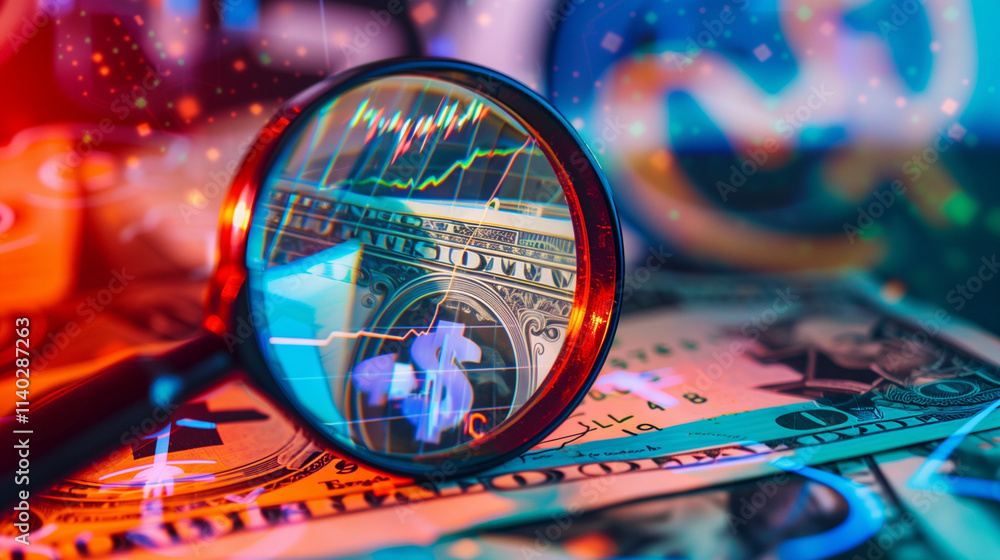 Bank Supervision Magnifying Glass Over Financial Documents, Regulatory Oversight Concept with Blurred Bank Logos and Currency Symbols