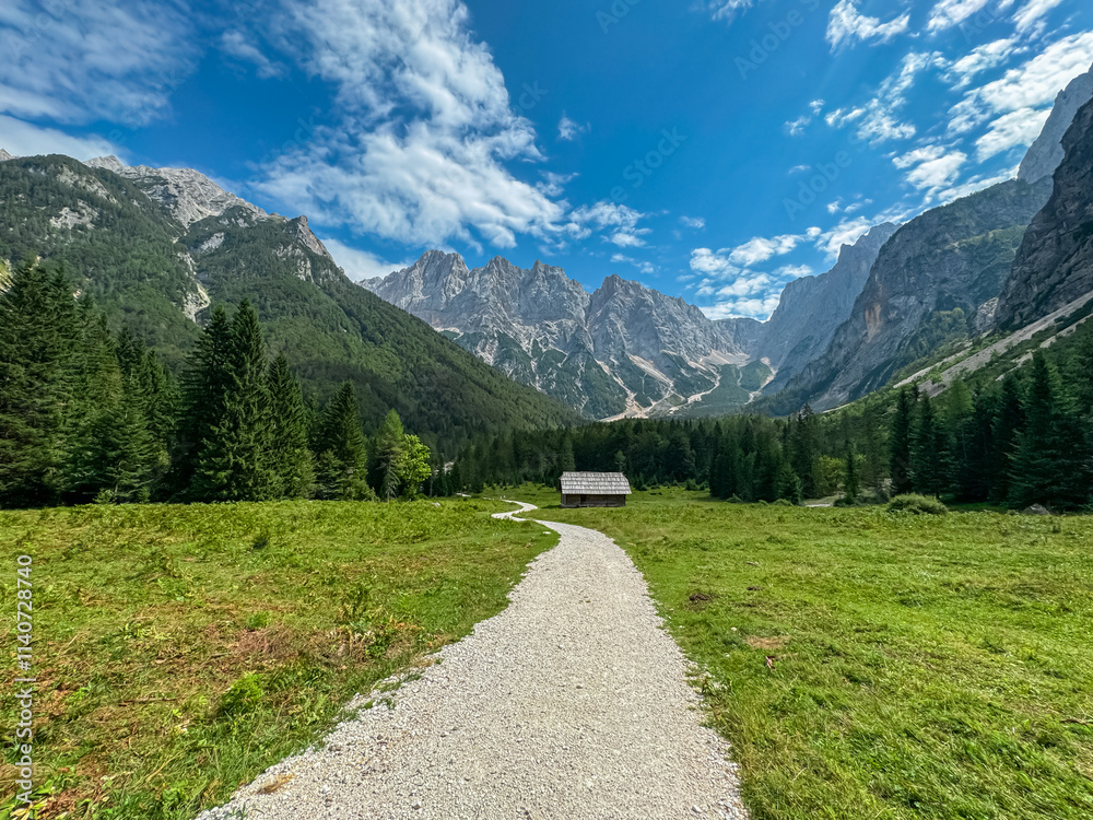 Scenic hiking trail along alpine meadow with wooden cottage overlooking rugged mountain peak Skrlatica in majestic Julian Alps. Wanderlust in Krnica valley, Triglav national park, Vrsic pass, Slovenia