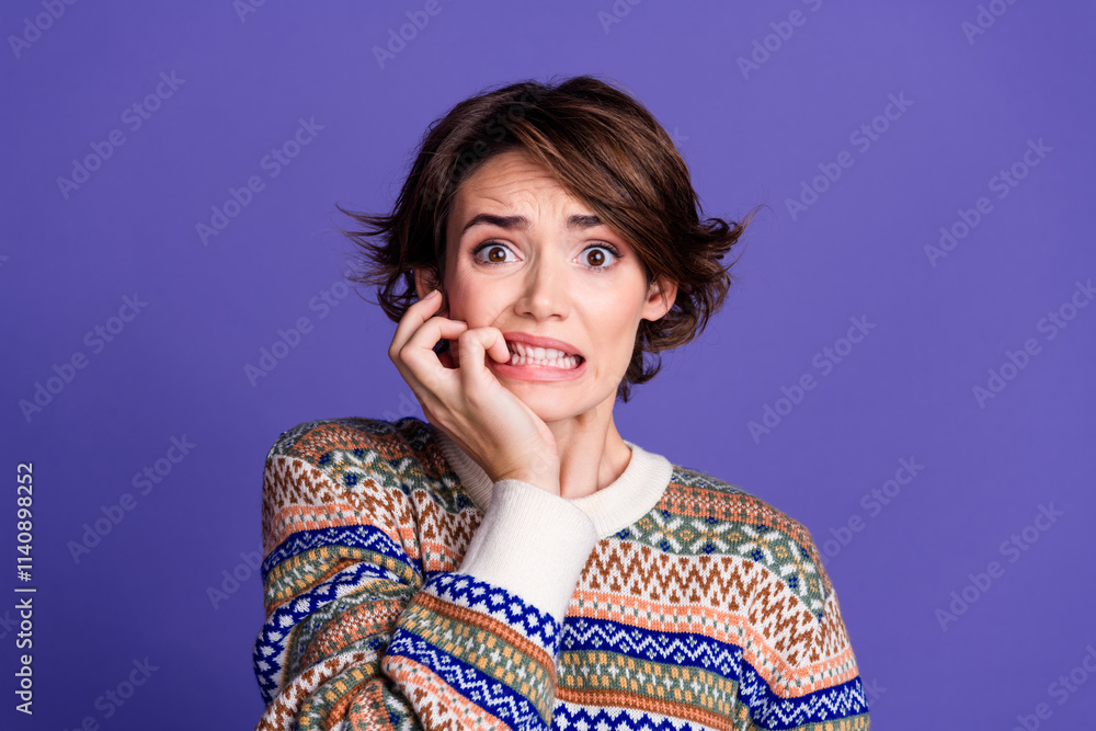 Photo of pretty worried nervous woman wear stylish clothes biting hand isolated on purple color background