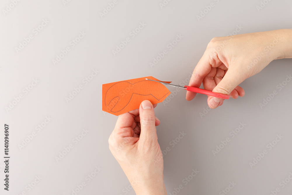 step in creative project, top down view hands cutting out detail from carton, claws made from orange paper, cut out details, grey background,