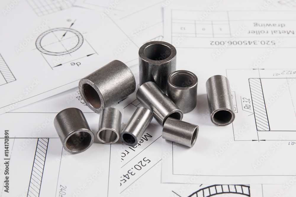 Metal cylinders on printed engineering drawings. Mechanics and Engineering Technology. Engineering drawings of steel parts