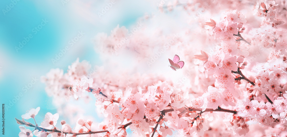 Branches of blossoming cherry against background of blue sky and fluttering butterflies in spring on nature outdoors. Pink sakura flowers, dreamy romantic artistic image of spring nature, copy space.