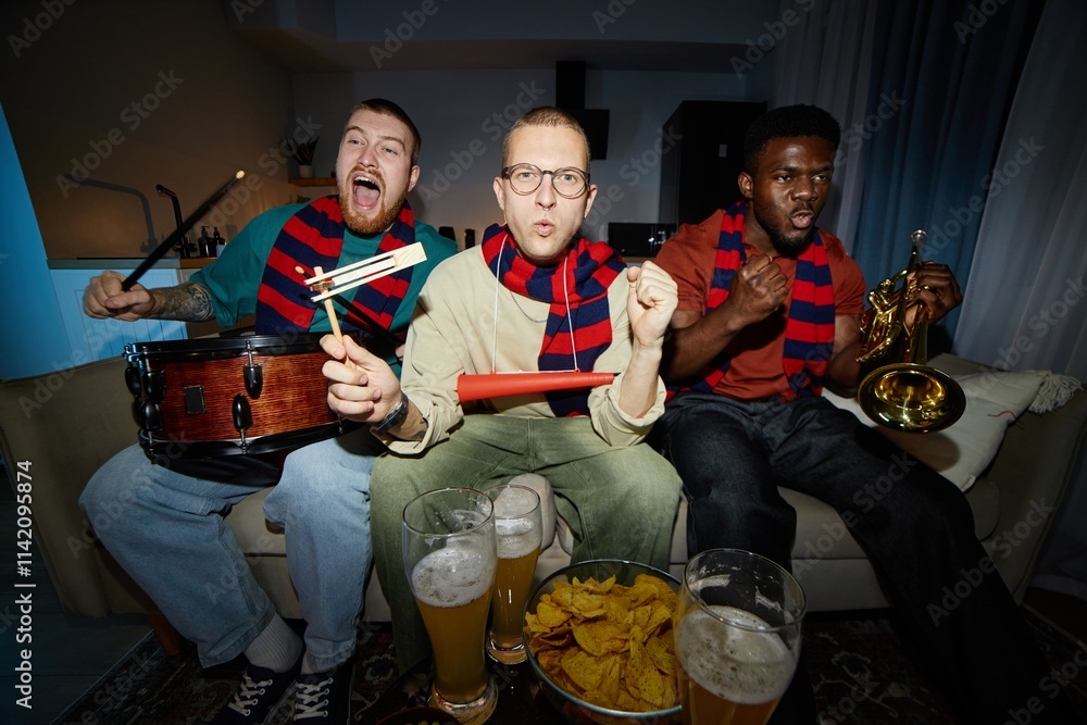 Fisheye front view of excited sports fans cheering and screaming sitting on couch together and wearing matching team scarves, shot with flash