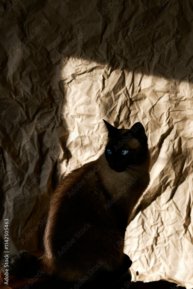 Siamese cat sitting in shadowy light against textured paper background