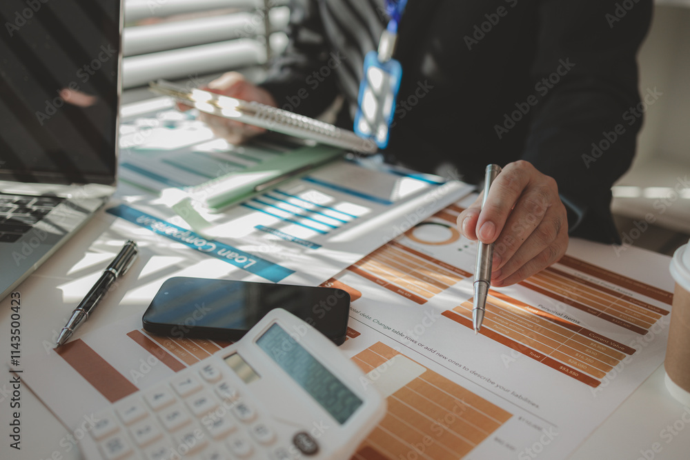 employees sit in an office with a pile of documents that need to be completed before work ends, entrepreneurs are planning their work to prepare for presentation to investors