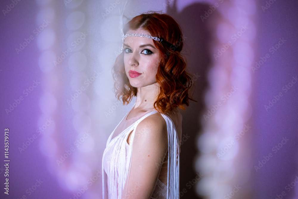 A young woman with red hair, dressed in stylish white clothing reminiscent of 1920s fashion. Her look is completed with a sparkling feather headband that adds elegance and vintage charm.