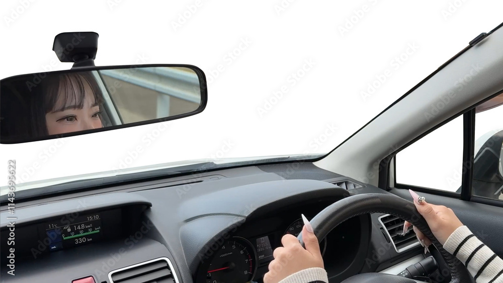 車を運転する女性のハンドルを持つ手とミラーに映る女性の顔 PNG透過素材