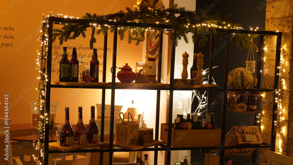 Festive Christmas Decoration including Christmas Tree and Candles with ambiant lights in a dark lid room.