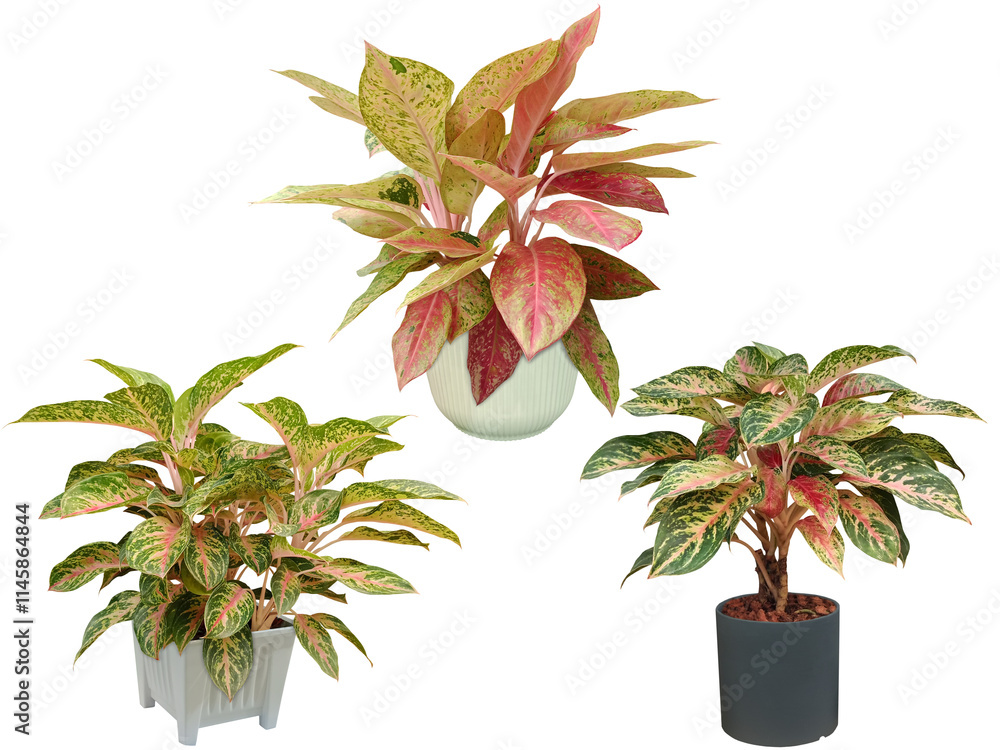 Close-up photo of three beautiful ornamental plants in pots, on a png file with transparent background.