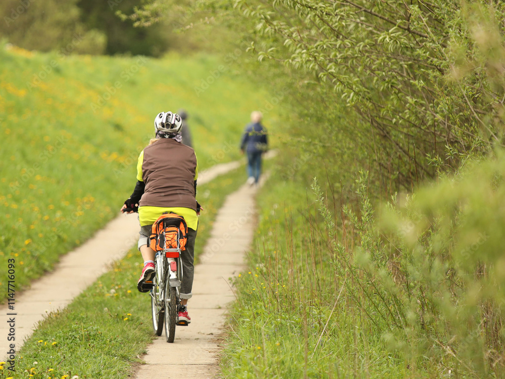 An old gray-haired woman rides a bicycle among the greens. A healthy and active part of life. Ecological transport for the population. Free time for retirement. Movement in space. Sports for the elder