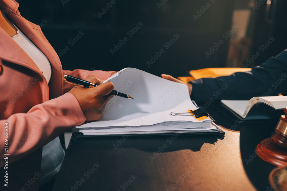 Judge gavel with Justice lawyers having team meeting at law firm background. Concepts of Law and Legal services.