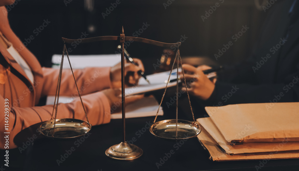 Judge gavel with Justice lawyers having team meeting at law firm background. Concepts of Law and Legal services.