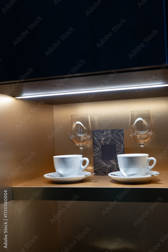 Stilvolle Tassen und Weingläser auf einem beleuchteten Regal