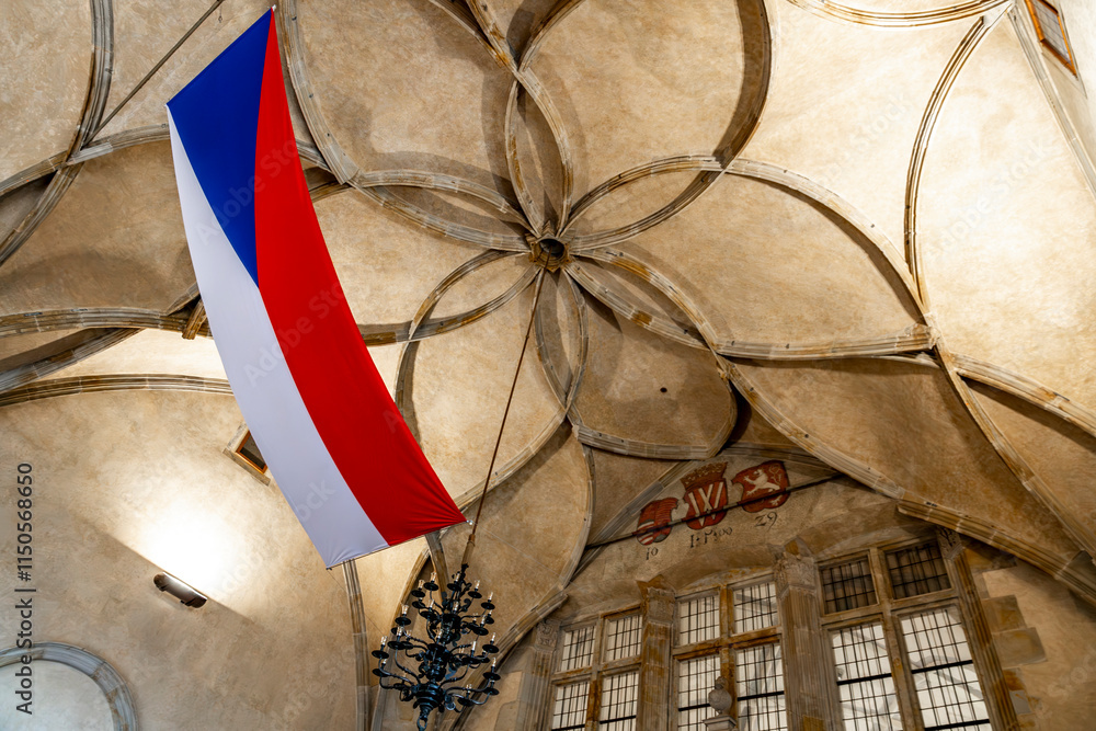 Gothic ribbed vault ceiling in Vladislav Hall, with Czech flag, inside Old Royal Palace, Prague Castle, Prague city, Czechia