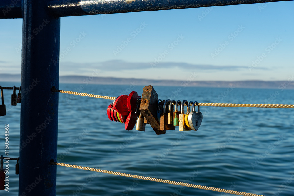 Liebesschlösser an einem Geländer mit Blick auf den Balaton in Siófok, Ungarn