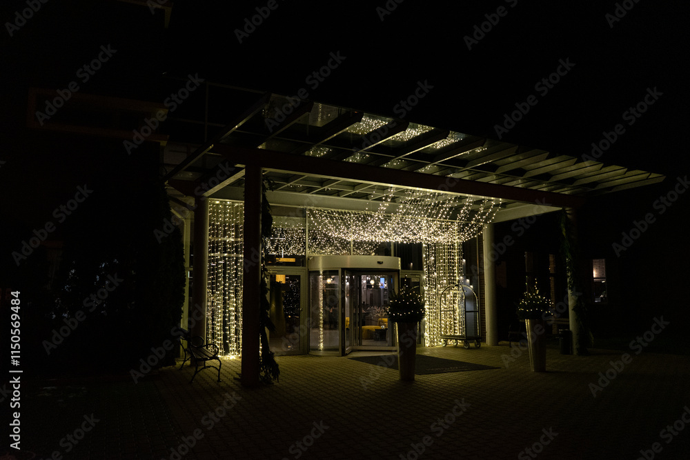 Festlich beleuchteter Hoteleingang mit Lichterketten und Dekoration in Siófok, Ungarn