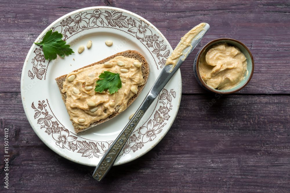 Hummus toast on wooden background. Traditional eastern food with chickpeas, tahini and olive oil. Toast on wooden background. Top view