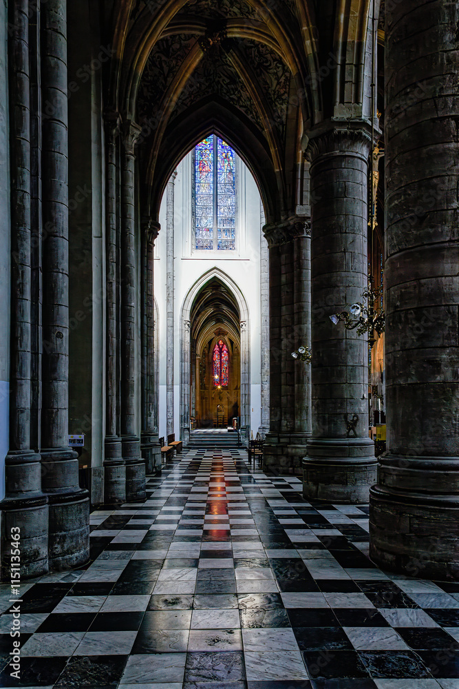 View of the stained glass windows of the church of St. Paul's Cathedral on July 18, 2015 in Liege, Belgium.