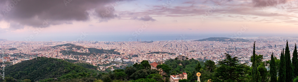 Panoramic view of Barcelona from a hilltop, capturing the sprawling cityscape against a dramatic sky, highlighting its dense layout and coastal edge.