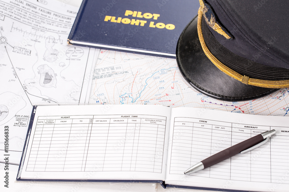 Close up of an airplane pilot equipment including flight log,hat