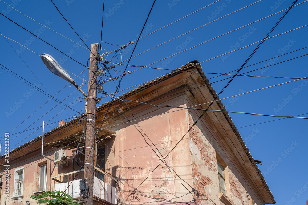 Lots of wires on the lamp post. Tangle of wires, electrical mess.