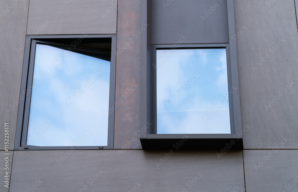 Two windows with metal frames on a modern building facade. The close-up exterior, artificial stone panels in a dark bronze color with aluminum flush-glazed window framing and sky-reflecting glass.