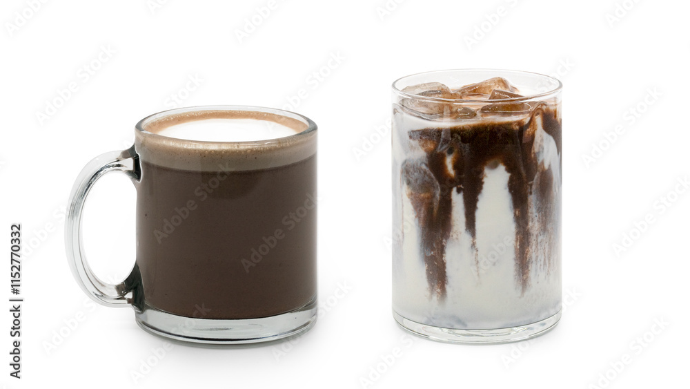 하얀 배경 위 아이스컵과 핫컵에 담긴 초코라떼