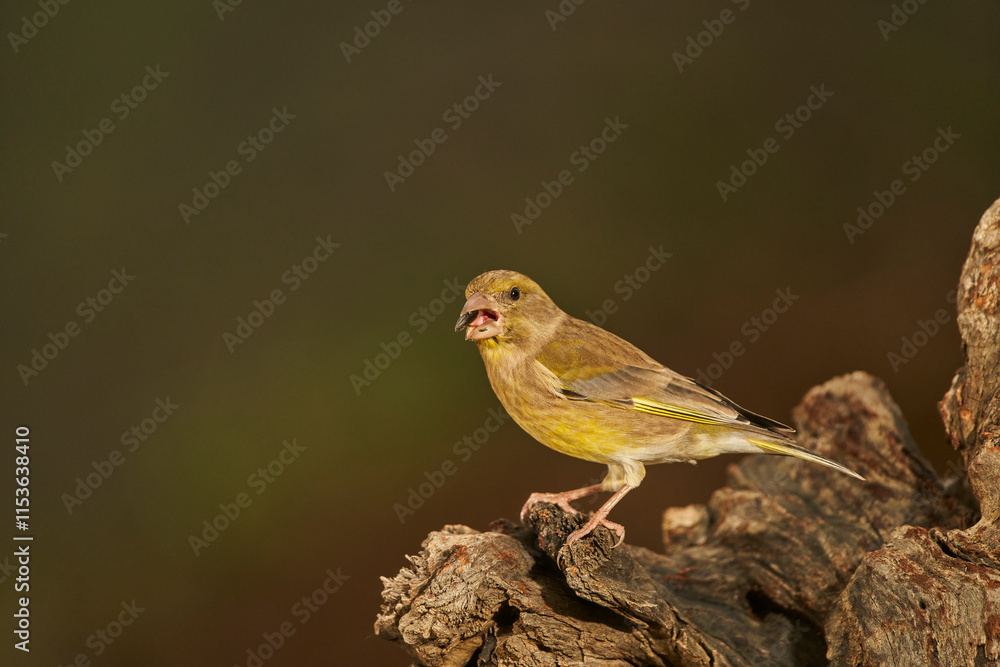 verderón europeo o verderón común (Chloris chloris) posado en un tronco