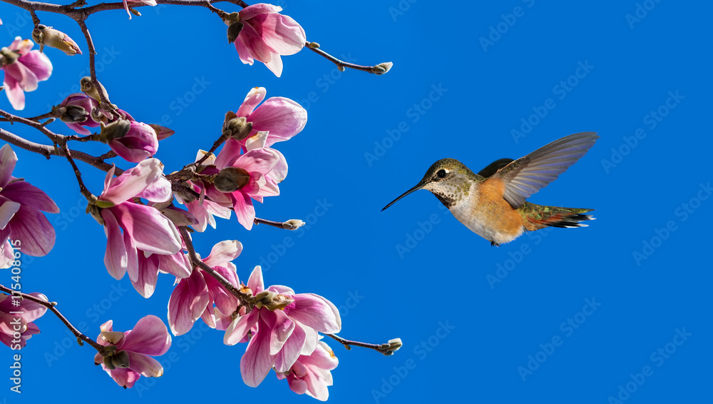 Rufous Hummingbird over clear blue sky background