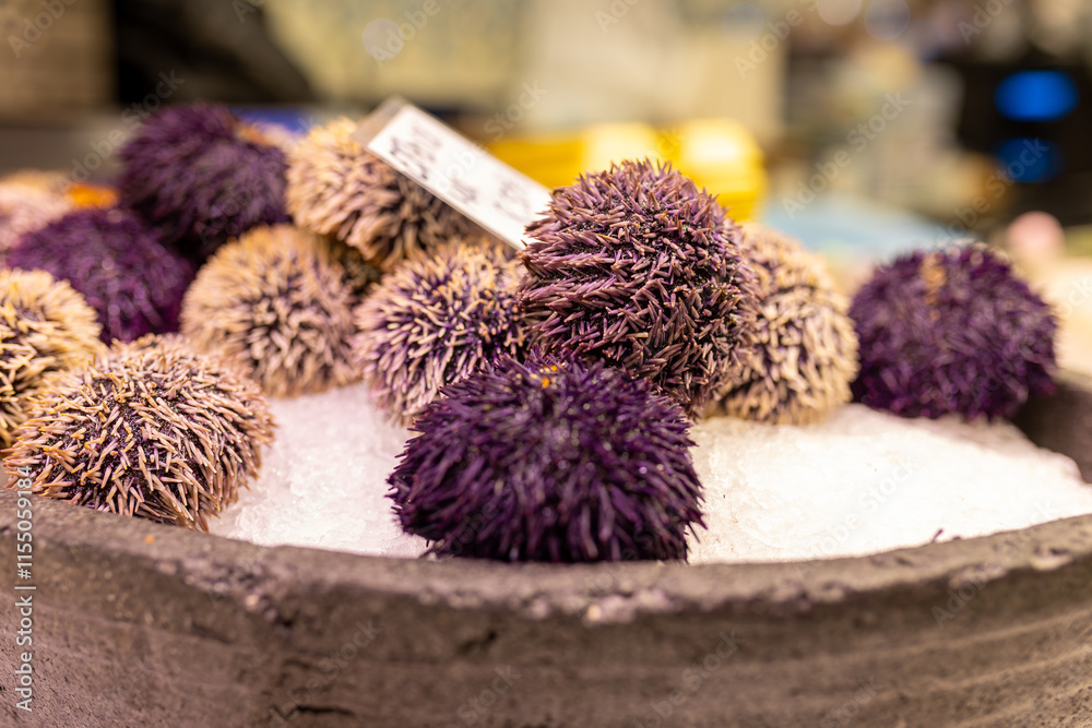 Fresh purple sea urchins displayed on ice in a market