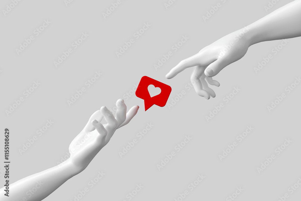 Hand to Hand. Abstract Imitation of Michelangelo's the Creation of Adam. The Hand of God Gives the Hand of Adam Social Media Network Love and Like Heart Icon. 3d Rendering