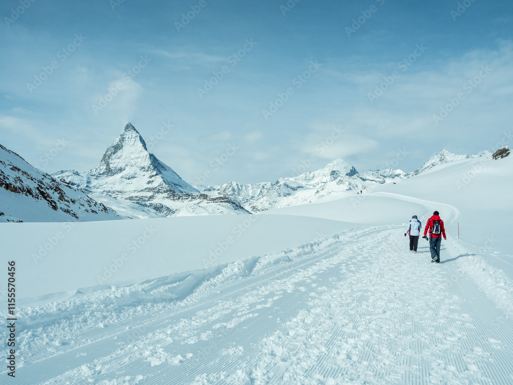 Hikers exploring snowy landscape in Zermatt, Switzerland with Matterhorn mountain view