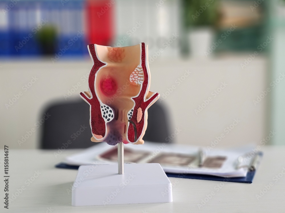 Model of unhealthy lower rectum with inflamed vascular structures. Problem of hemorrhoids and constipation concept