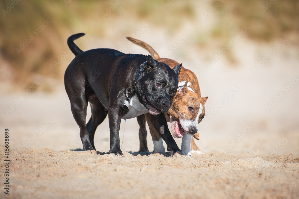 Two american staffordshire terrier dogs playing with a stick on the beach