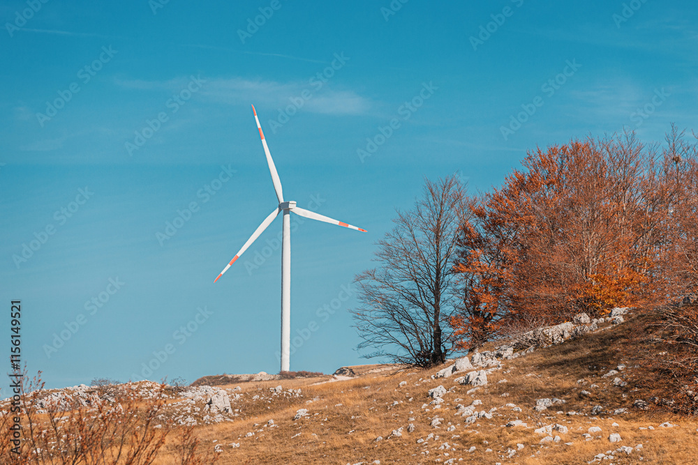 White wind turbine generating renewable energy on a mountain with autumnal trees and blue sky