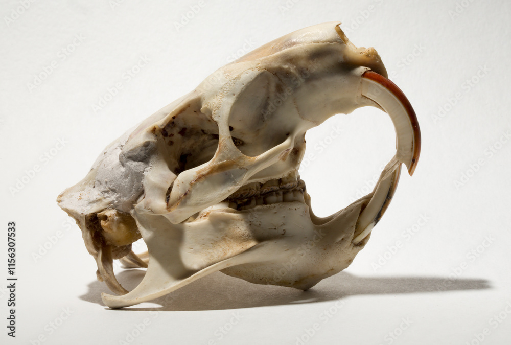 Skull of a nutria or coypu (Myocastor coypus) on a white background. The bones of the head of the animal.
