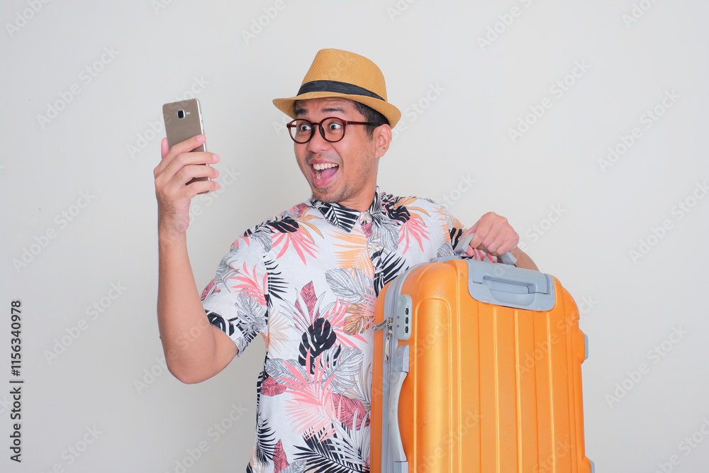 A man staring at his phone with excited face when carry a luggage
