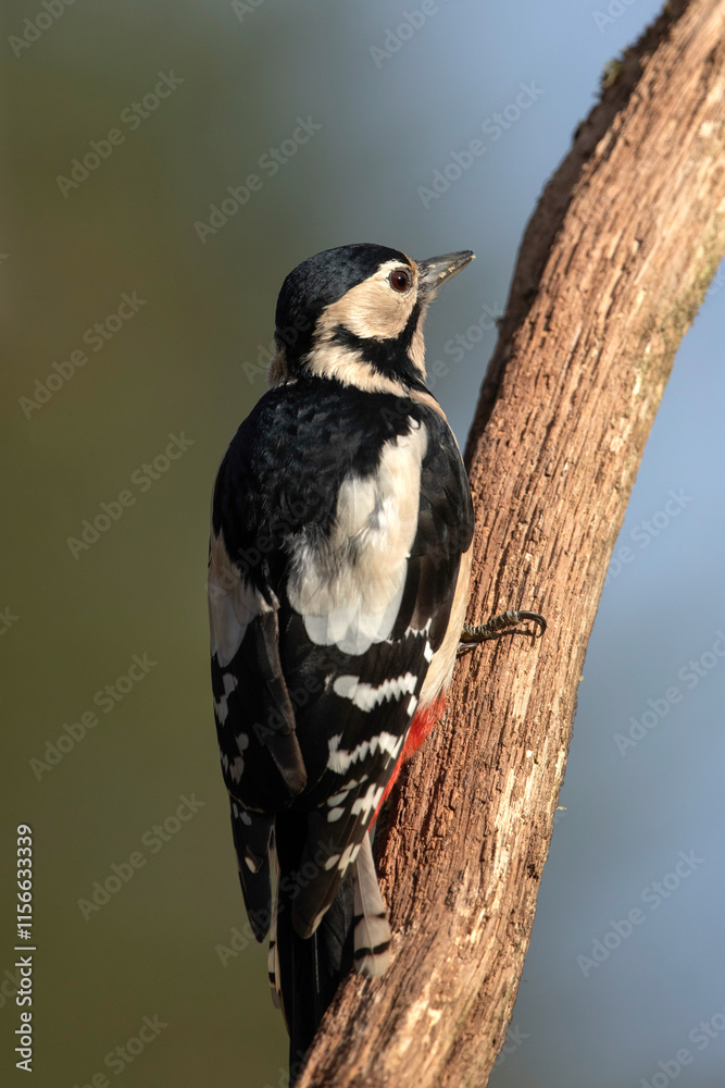 Great Spotted Woodpecker (Dendrocopos major) on a branch showing back and side of bird