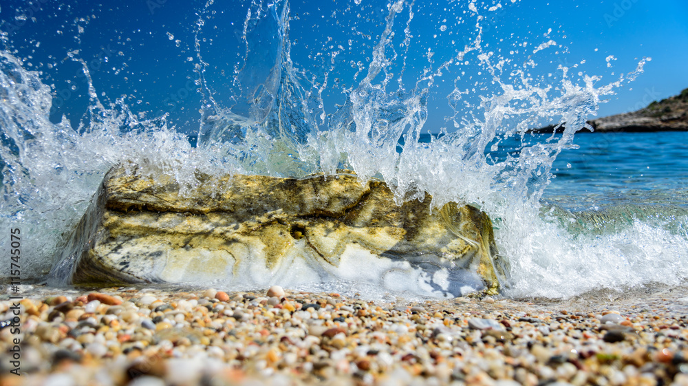 Amazing water splash over a single rock on a beach at Thassos island, Greece - perfect vacation spot