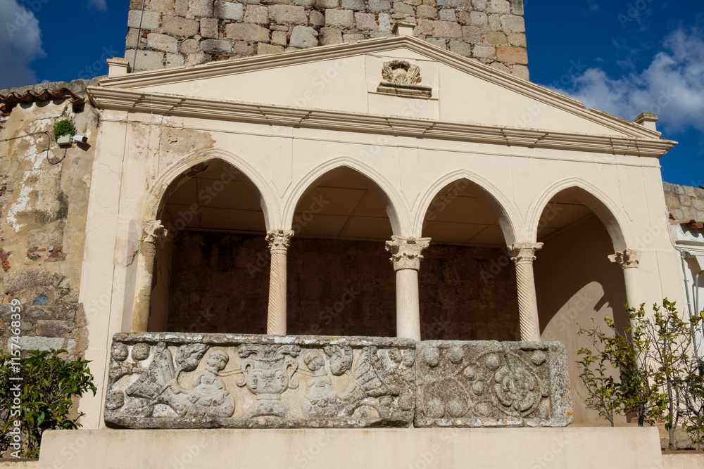 Neo-Gothic portico reusing Roman capitals in the Alcazaba of Merida, Spain.