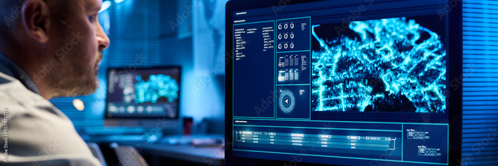 Header of computer monitor with army location and mature operator of military office sitting in front of screen with graphic data