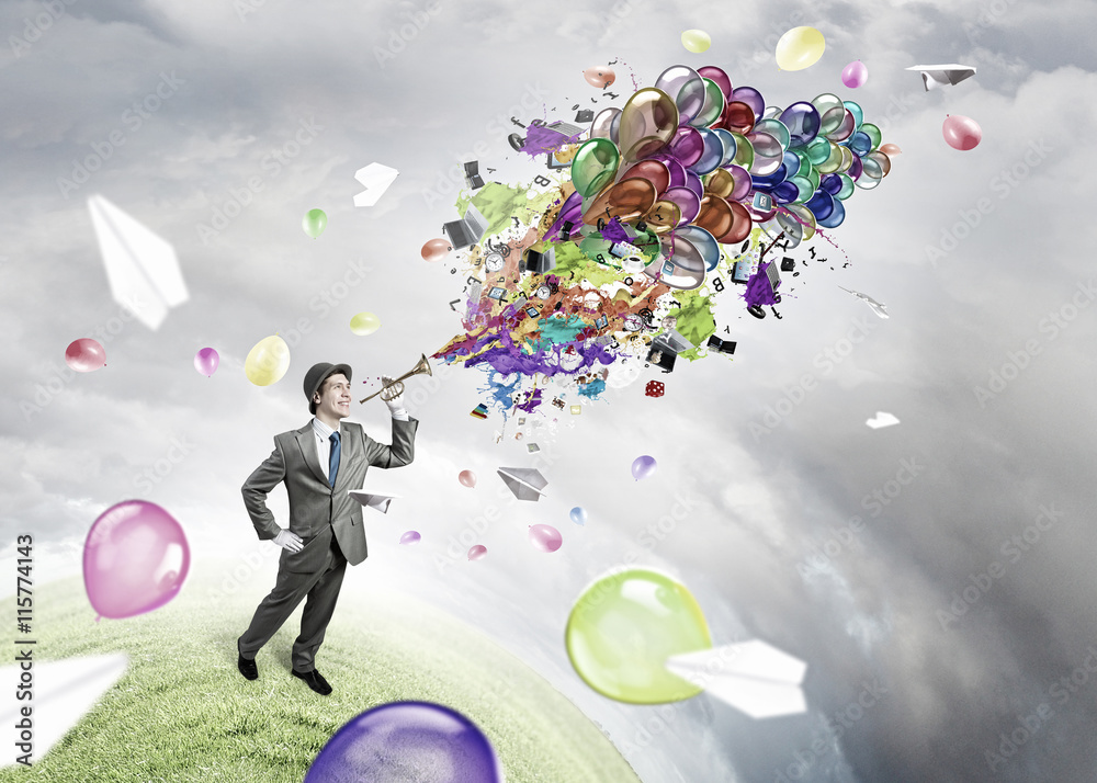 Comedian man play fife . Mixed media