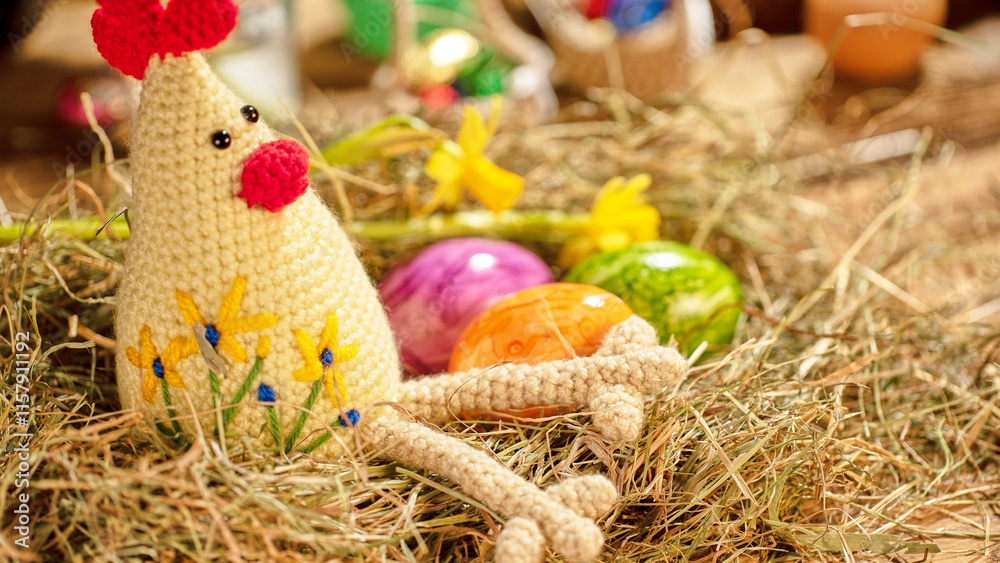 A whimsical crochet chicken sits in a bed of straw, surrounded by vibrant, hand-painted Easter eggs and yellow flowers, creating a charming springtime tableau.