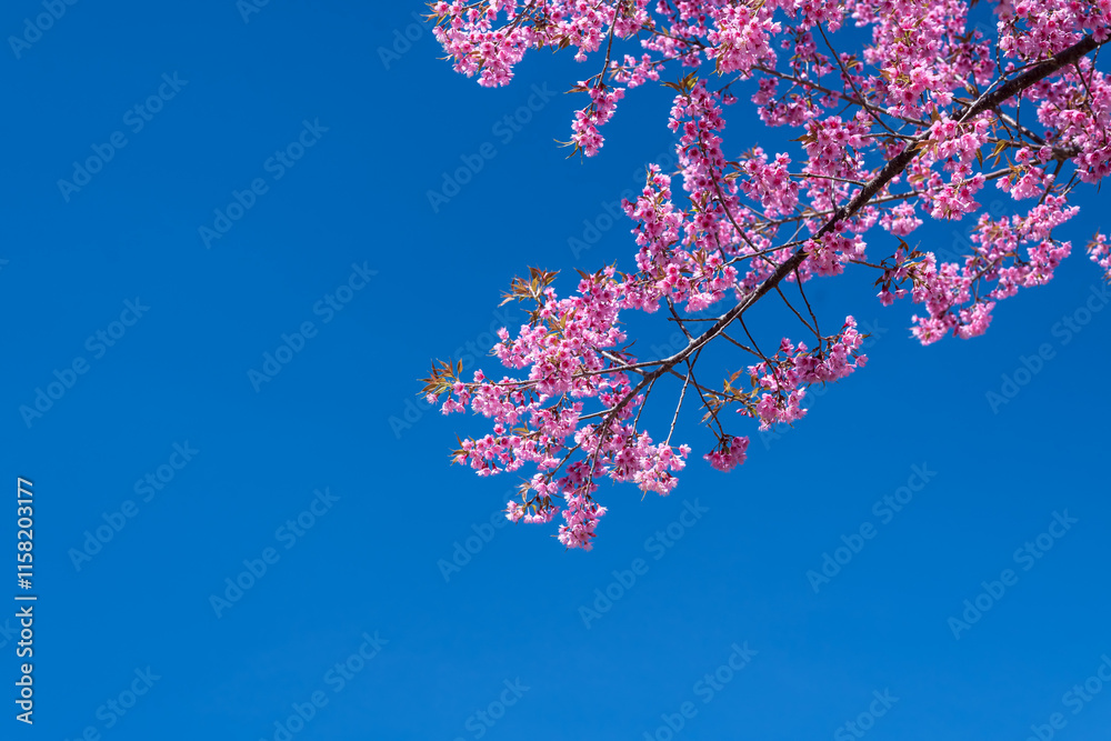 Prunus cerasoides flower on tree in forest with blue sky at Chiang Mai province in Thailand.