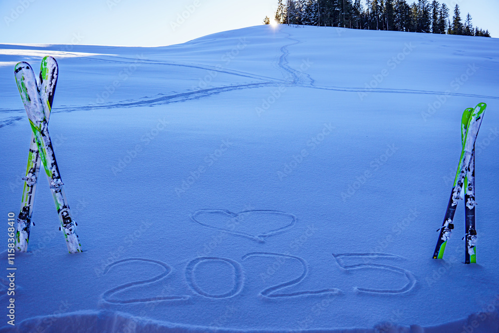 Happy New Year 2025! The numbers 2025 and a heart drawn in snow. Background for winter holidays. A pair of skis on the right and left are stuck in the snow