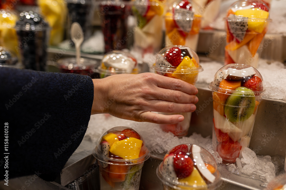 Unrecognizable person picking fresh fruit in a plastic cup at a market